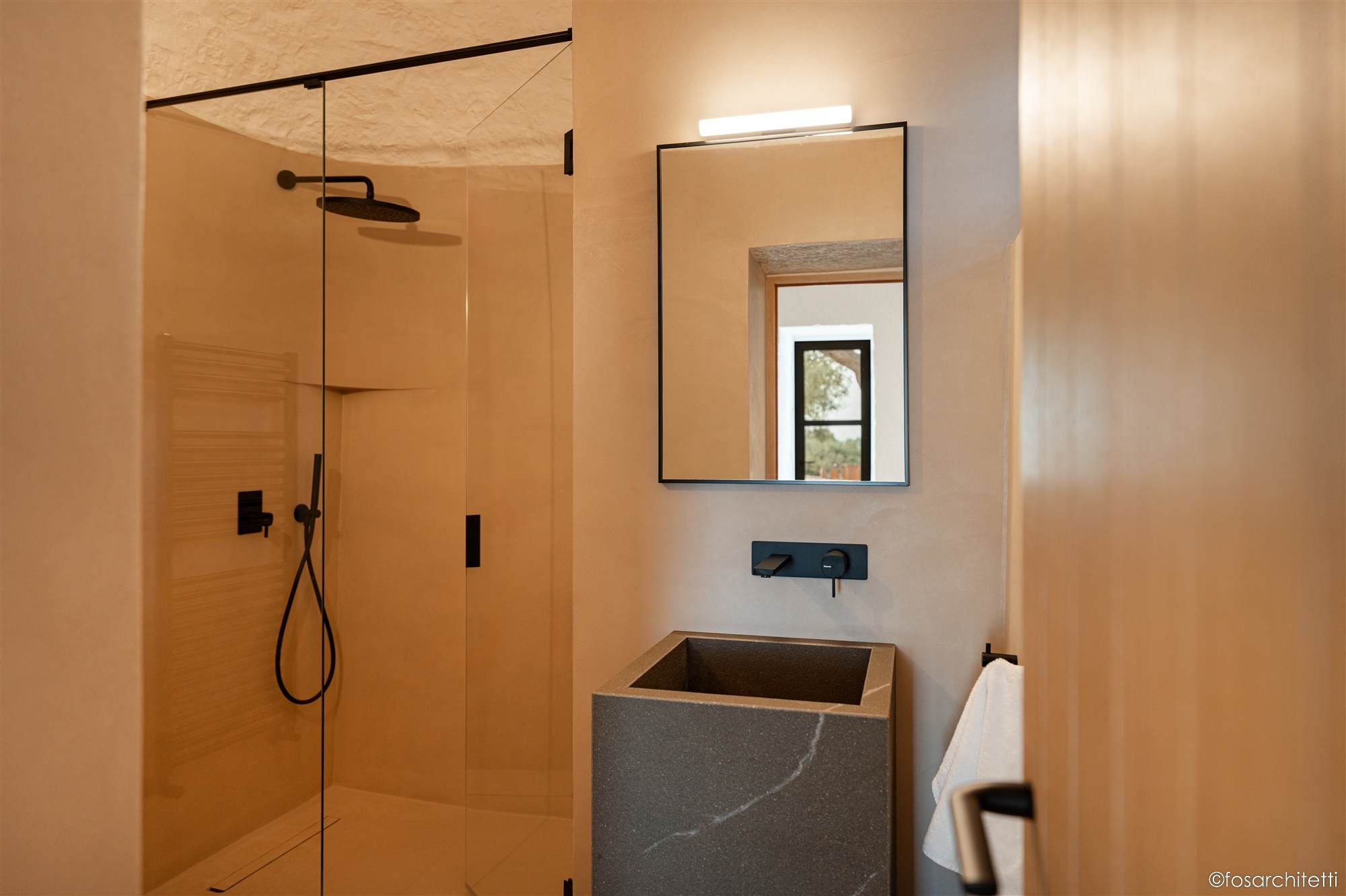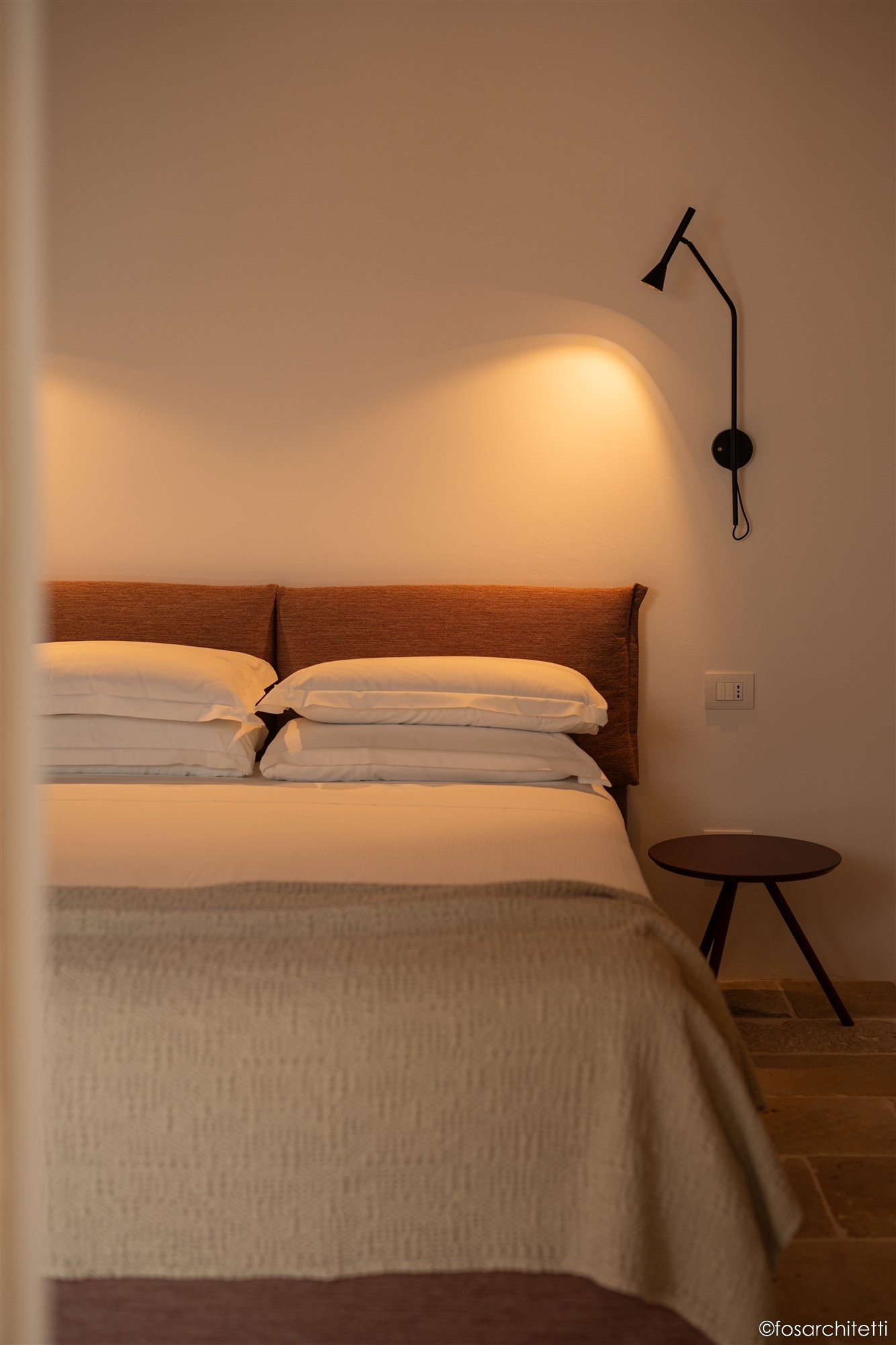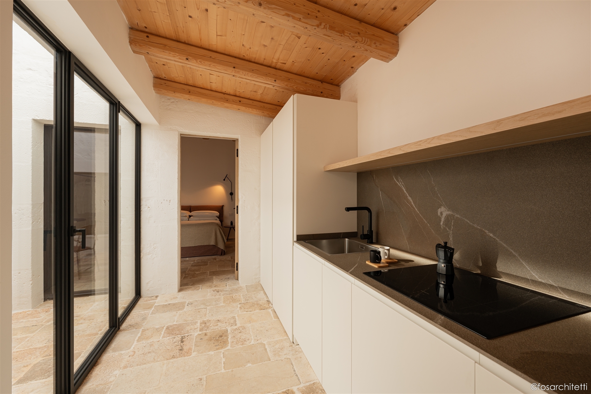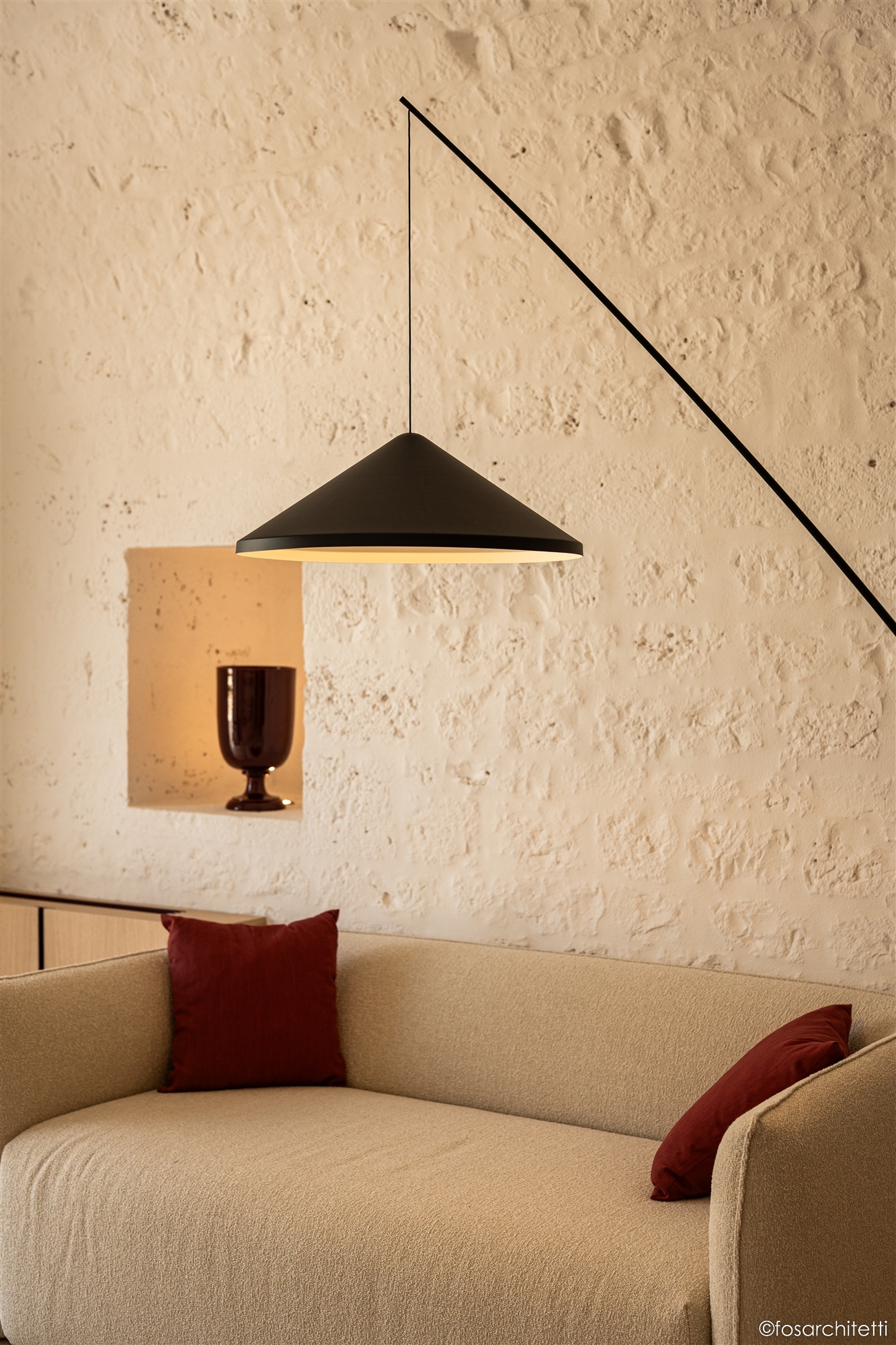 Il recupero delle murature in pietra e delle volte originarie restituisce l’autenticità del luogo, mentre un linguaggio progettuale contemporaneo introduce ambienti essenziali, raffinati e calibrati sul comfort. Gli interni, definiti da arredi su misura, palette cromatiche essenziali e materiali sobri creano un dialogo equilibrato tra passato e presente.