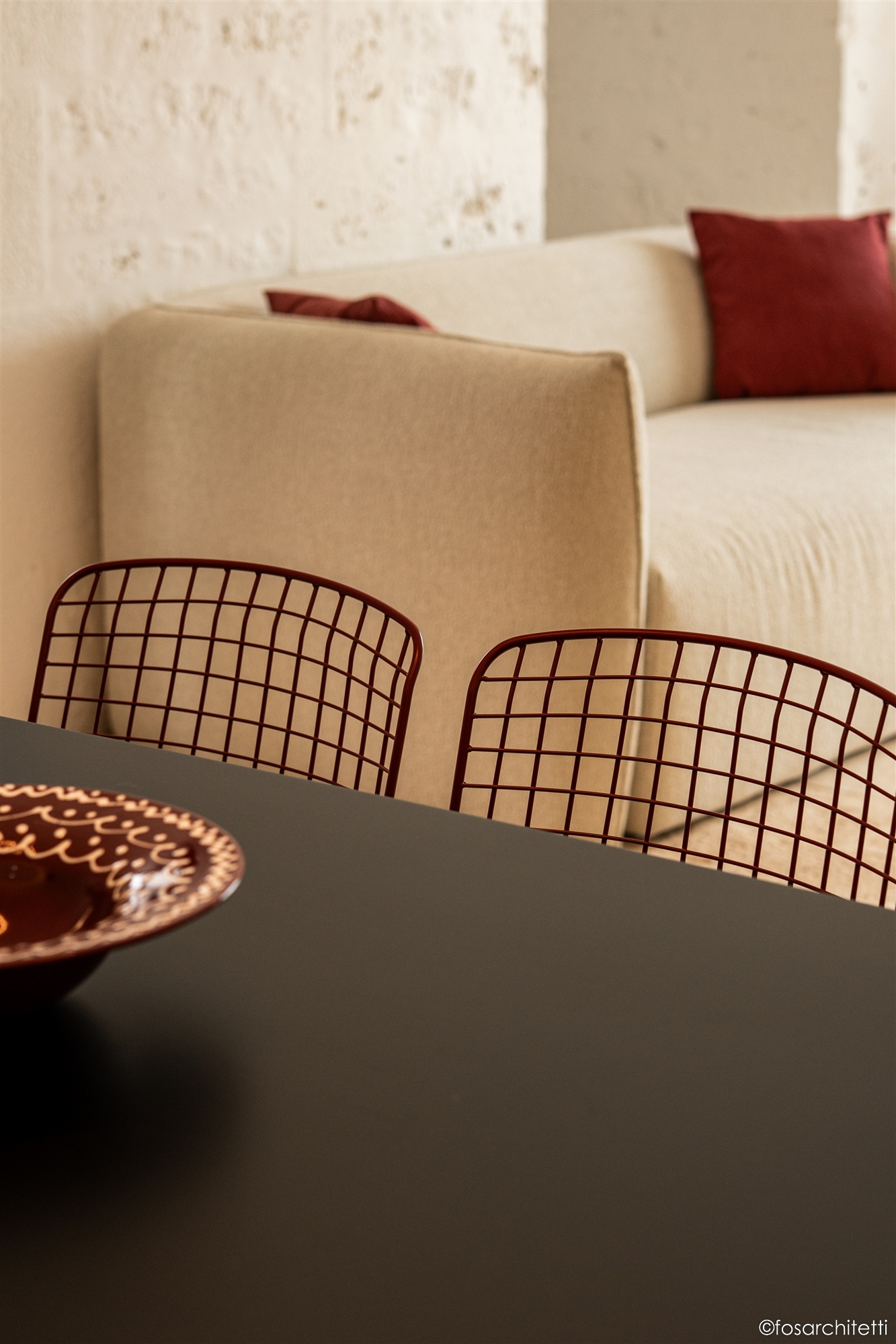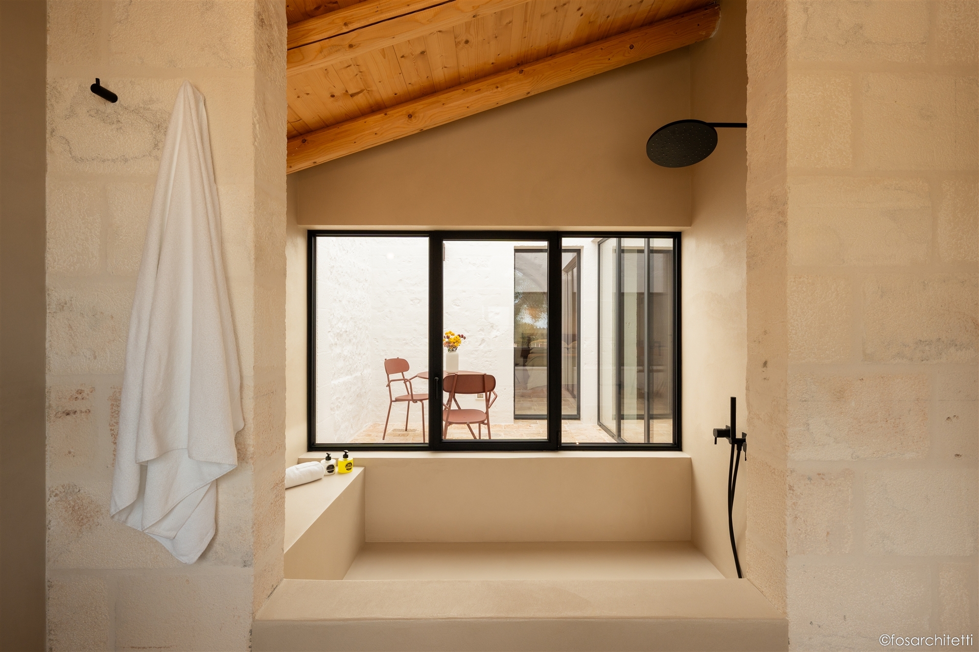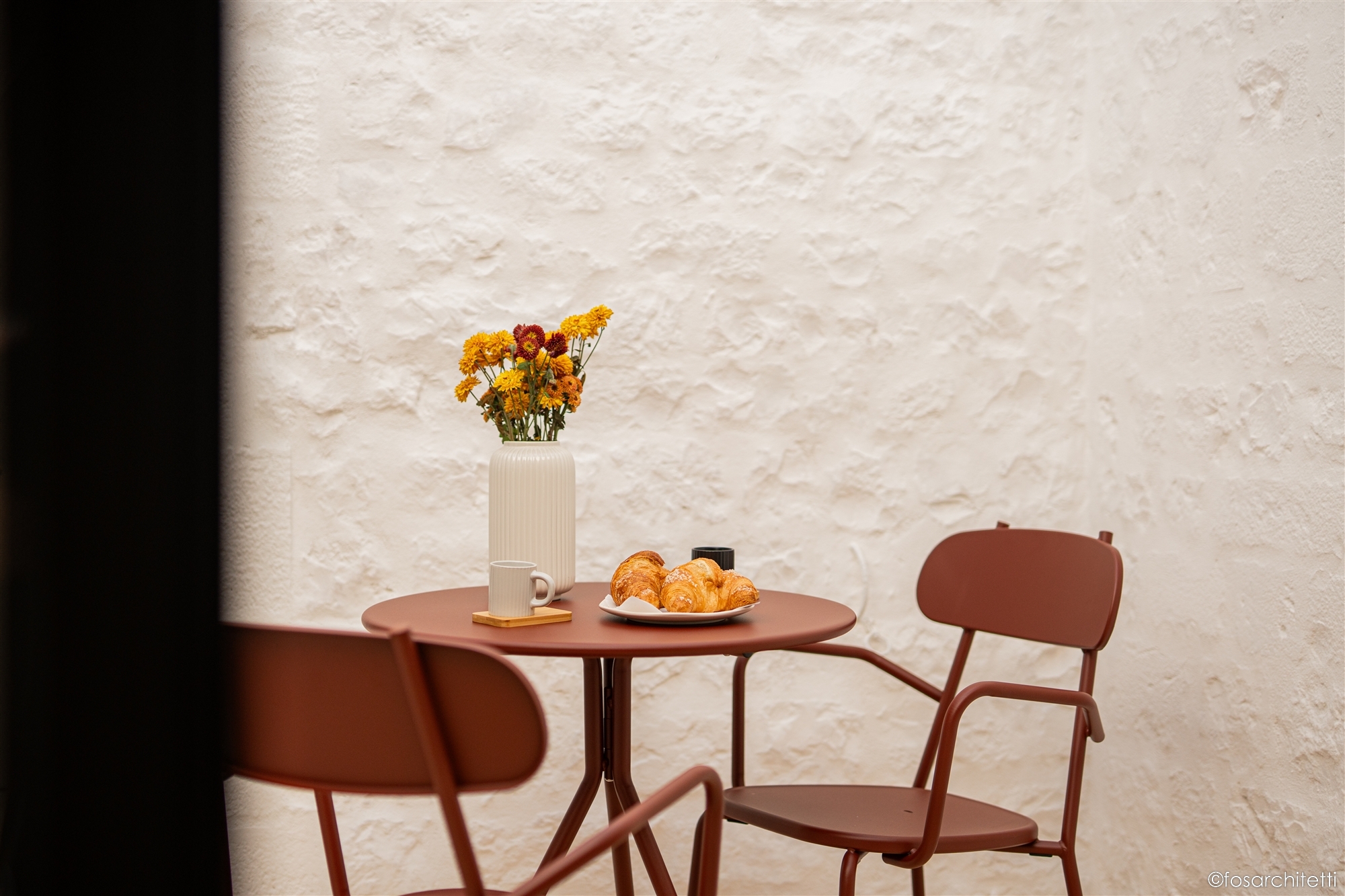 Il recupero delle murature in pietra e delle volte originarie restituisce l’autenticità del luogo, mentre un linguaggio progettuale contemporaneo introduce ambienti essenziali, raffinati e calibrati sul comfort. Gli interni, definiti da arredi su misura, palette cromatiche essenziali e materiali sobri creano un dialogo equilibrato tra passato e presente.
